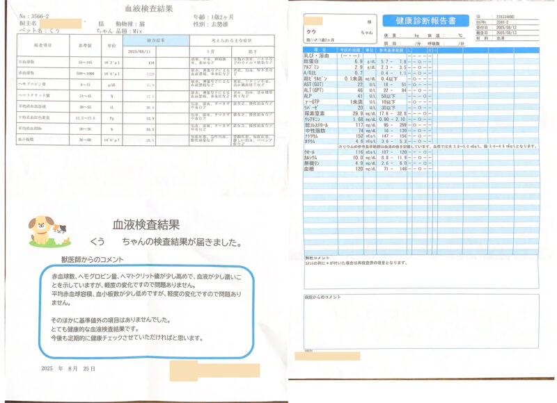 やんちゃで甘えん坊なくうですが、落ちているゴミを食べてしまう癖があるので、安心のために血液検査をしてもらいました。